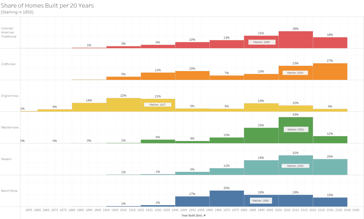 English homes are oldest (median year: 1927) Ranch homes mostly date to the 1980s Colonial: 1996 Craftsman: 2000 Mediterranean: 2001 Modern: 2004
