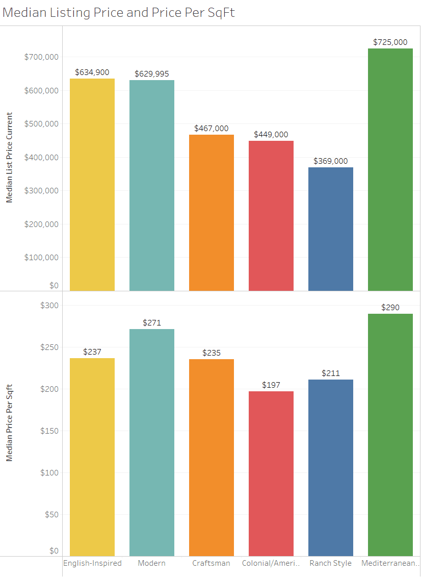Mediterranean and European-style homes top the charts with a median price of $725,000. Ranch homes sit at the bottom, priced more affordably at $369,000. Modern and Craftsman homes fall somewhere in between, often commanding a premium on a price-per-square-foot basis thanks to newer construction and urban infill locations.