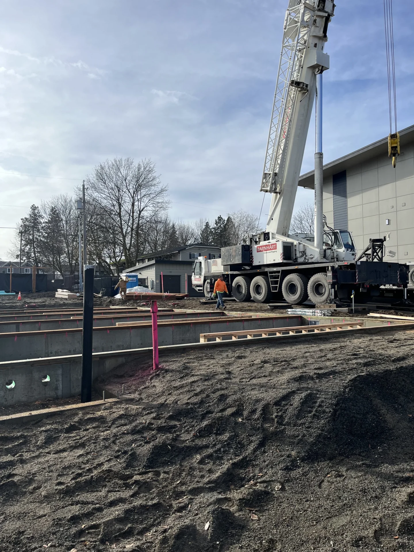 • In parallel with the fabrication of the modules in the factory, site work is underway, with preparation of a standard concrete foundation and routing of major utilities.