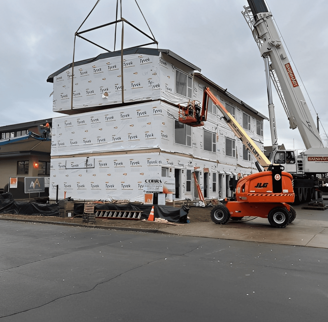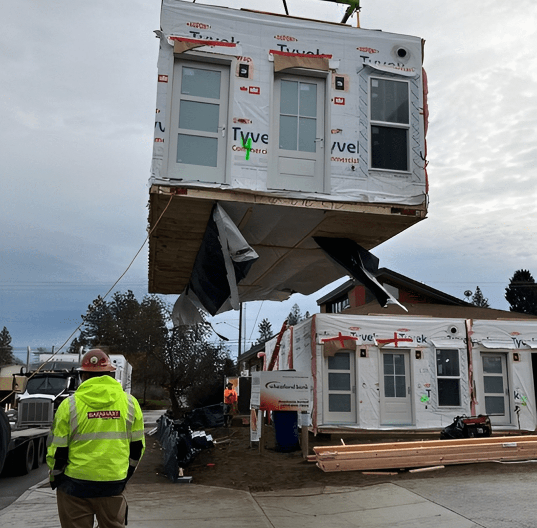 Located in Spokane, Washington, DanReDev LLC's pilot project refined the design for our kit-of-parts concept and validated the use of modern modular construction techniques. Modules were built in a climate-controlled factory and delivered by truck to the site with the interiors fully completed. The modules were set in place by crane over four days, followed by the completion of subsequent site work.